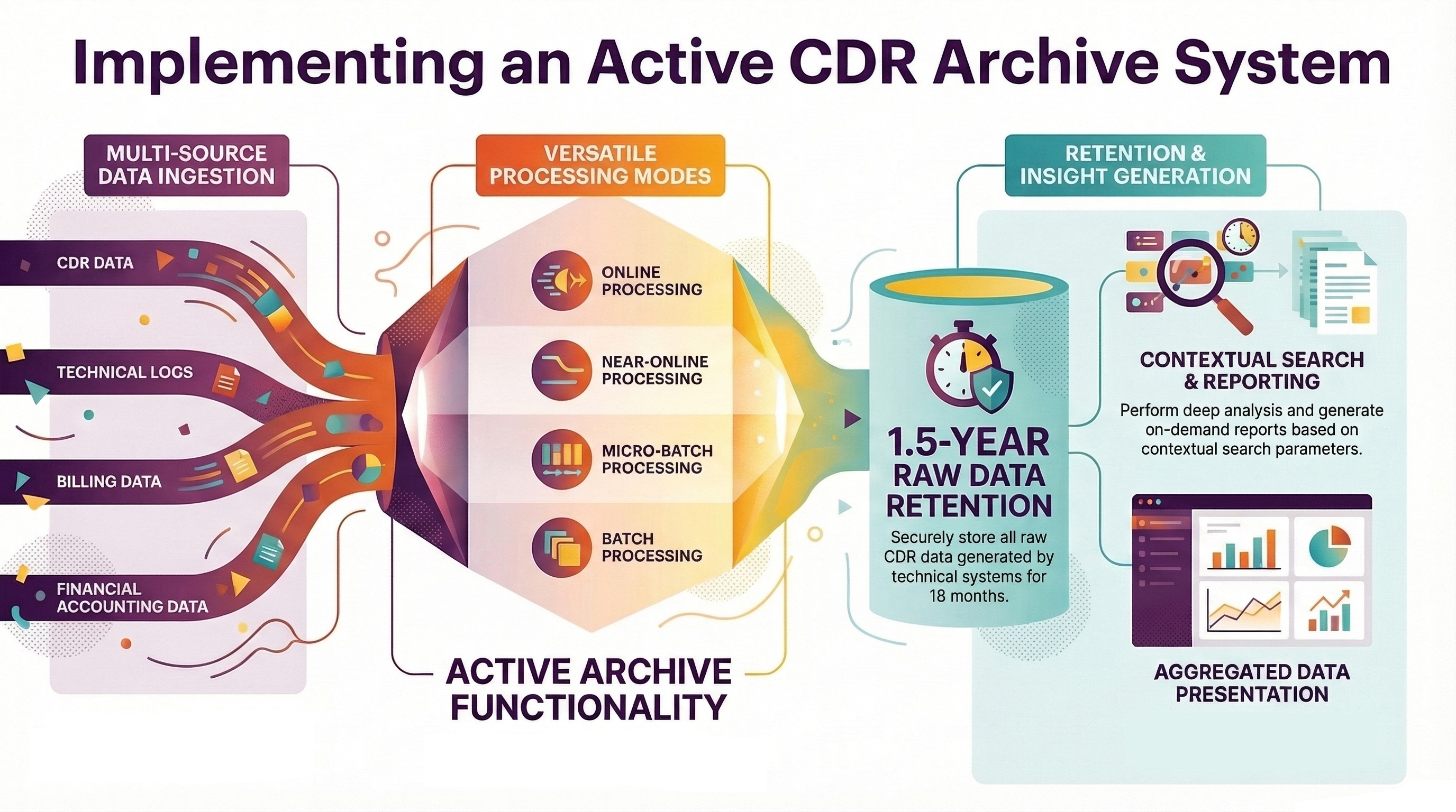 Ключовим завданням стала консолідація CDR (Call Detail Records) та технічних логів у надійному середовищі з підтримкою як пакетної, так і потокової обробки. Окремою вимогою було створення активного архіву CDR із можливістю контекстного пошуку та формування звітів за запитом. Також замовнику було важливо поєднати хмарну доступність сервісів із економічно обґрунтованою вартістю зберігання сирих даних (не менше 1,5 роки згідно вимог законодавтсва) у наземному дата-центрі.