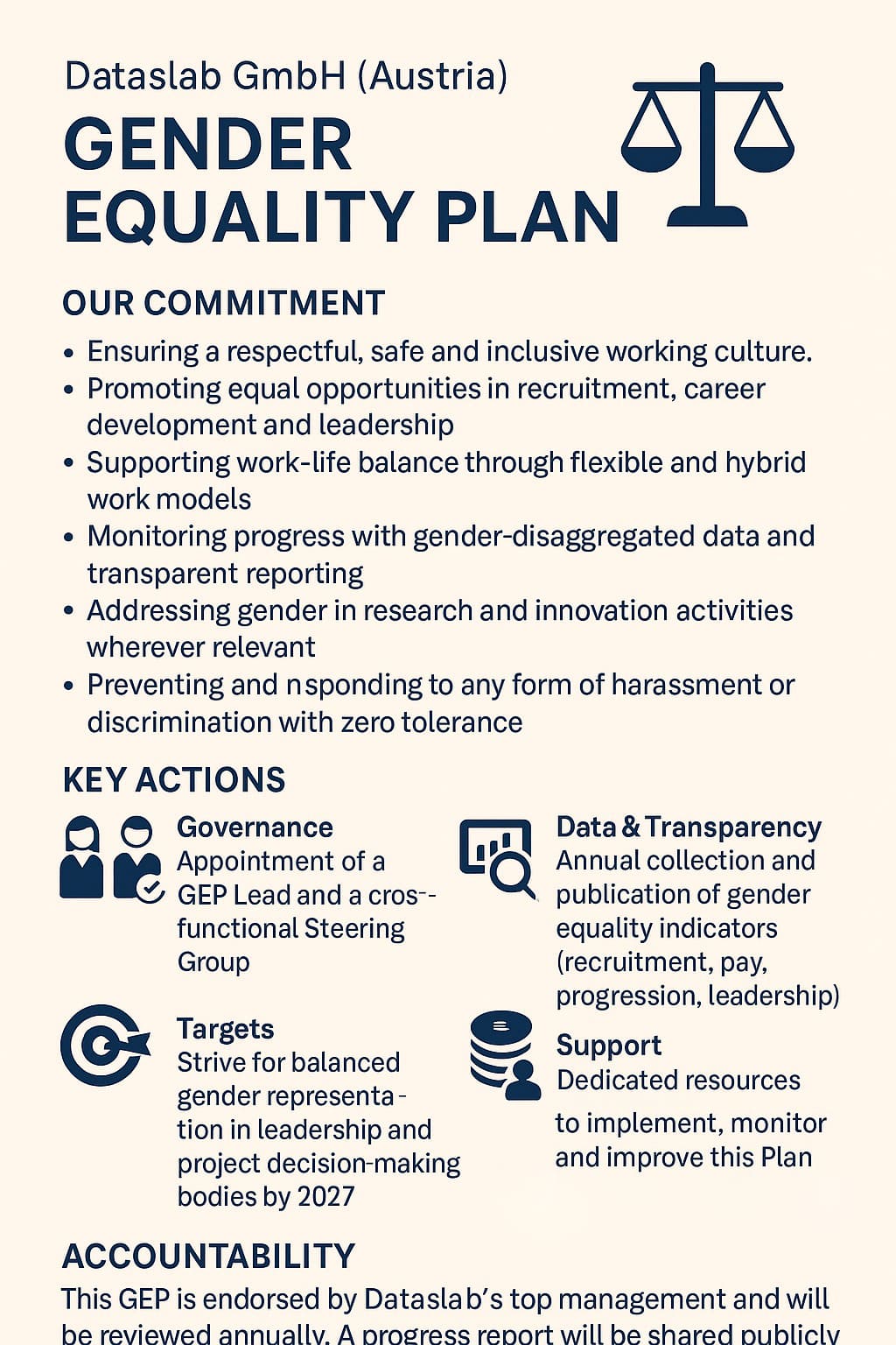 - Data & transparency: Annual collection and publication of gender equality indicators (recruitment, pay, progression, leadership).